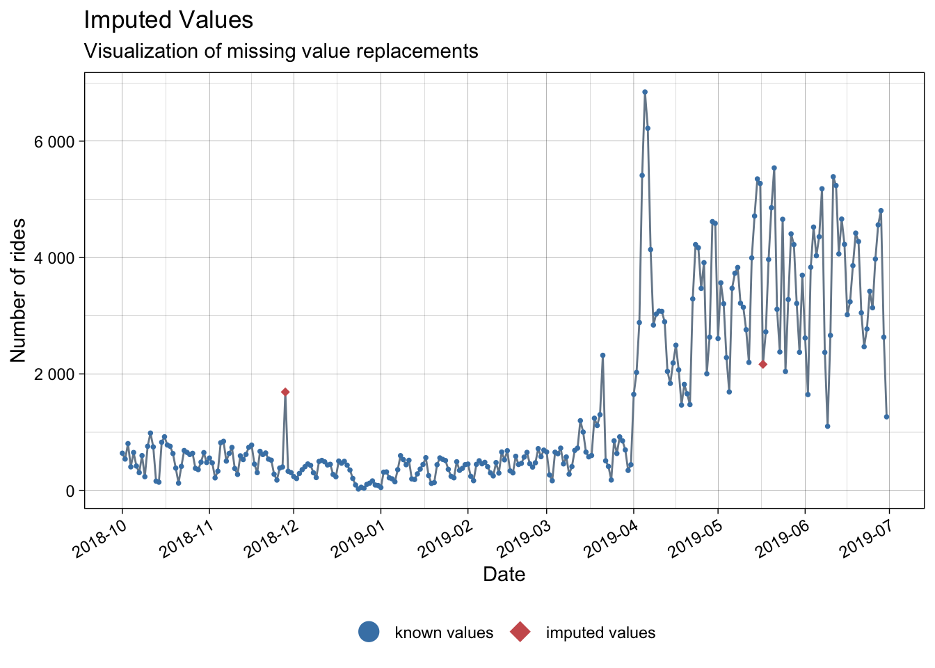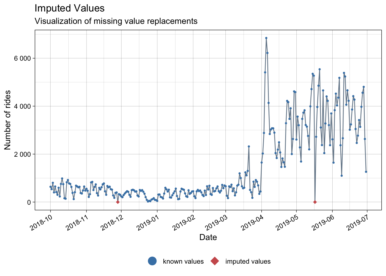 I was recently looking into some open data from the City Bikes in Bergen, Norway, when I discovered something weird: data from the last day of each month was often missing. However, this proved to be the perfect opportunity to try a package I been wanting to test out for a while, namely {imputeTS}. Let’s try to impute the missing observations using this package.