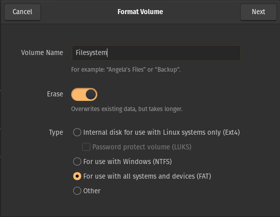 Give the disk a name of your choosing, and make sure that you select “For use with all systems and devices (FAT)” as the type.